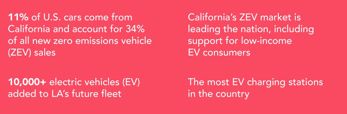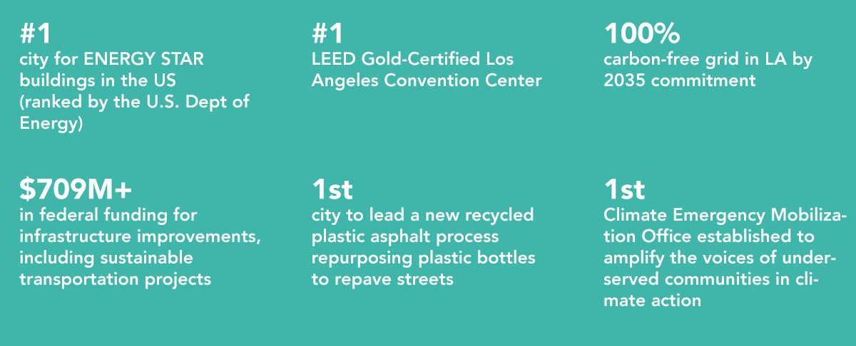 - Mayor Karen BassWe have worked urgently to build a greener Los Angeles to make a healthier and more sustainable city. Our work has led to significant increases in EV charging infrastructure, record amounts of storm water captured, and reducing emissions throughout the city with the goal of hitting 100% clean energy by 2035.